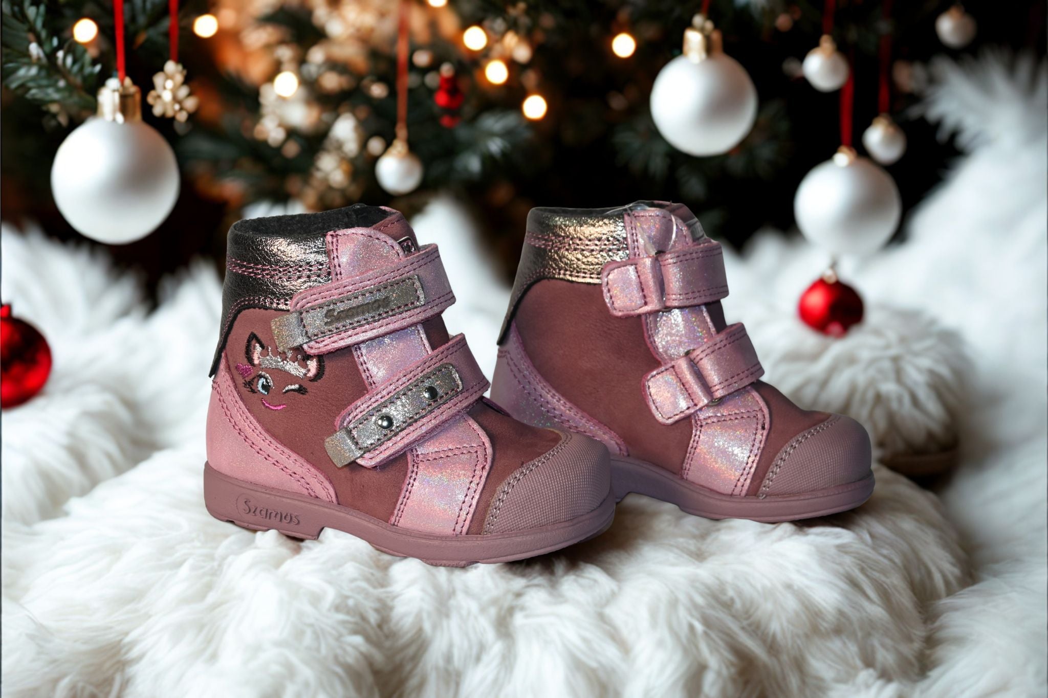 Szamos Kids Girls’ Genuine Leather Shoes – Ergonomic Supportive Sole, Stable Heel, Flexible Forefoot, Adjustable Hook & Loop Straps, Embroidered – Pink/Silver with Owl & Floral Design
