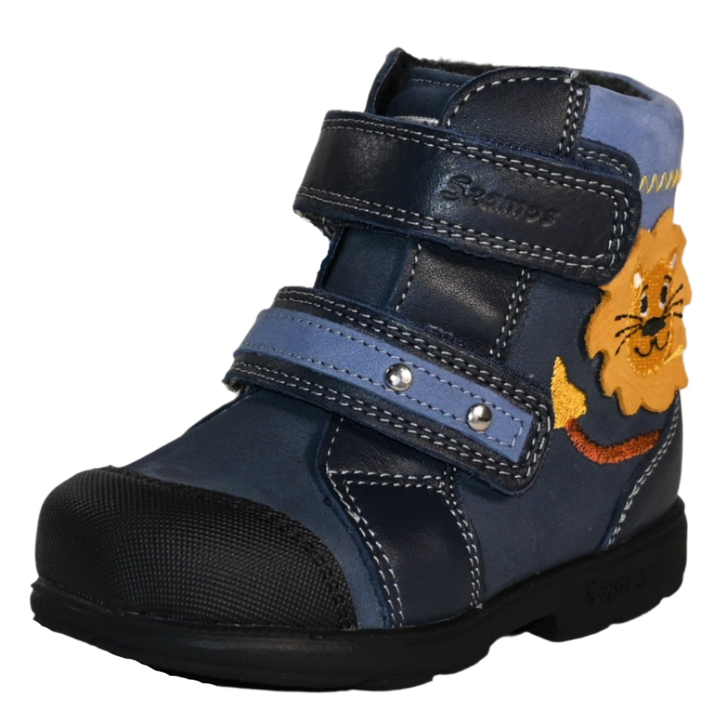 Szamos Kids Boys’ Genuine Leather Orthopedic Boots – Arch Support Shoes with Corrective Support for Flat Feet & Overpronation, Stable Ankle Support, Faux Fur Lining, Adjustable Straps, Navy Blue with Lion Designs