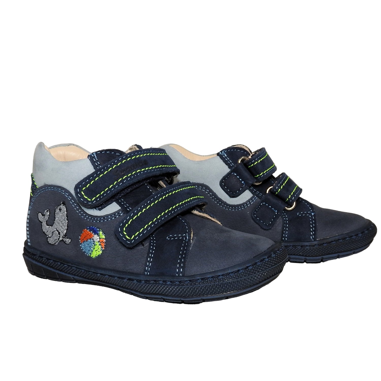 Szamos Kids Boys’ Genuine Leather Shoes – Ergonomic Supportive Sole, Stable Heel, Flexible Forefoot, Adjustable Hook & Loop Straps, Embroidered – Navy with Seal & Ball Design