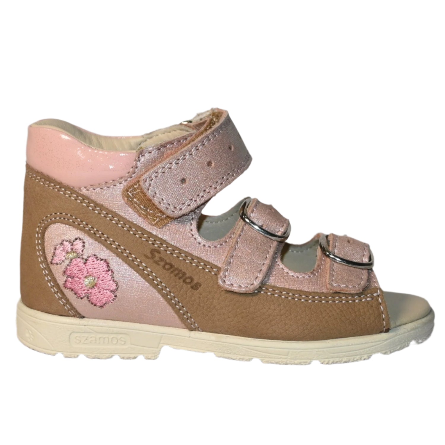 Szamos orthopedic girls’ sandals in soft pink genuine leather, decorated with delicate floral embroidery. Designed with a supportive orthopedic sole and three adjustable straps, they ensure proper foot alignment and a secure, customizable fit. Perfect for both indoor and outdoor wear — ideal for nursery, preschool, or everyday adventures.